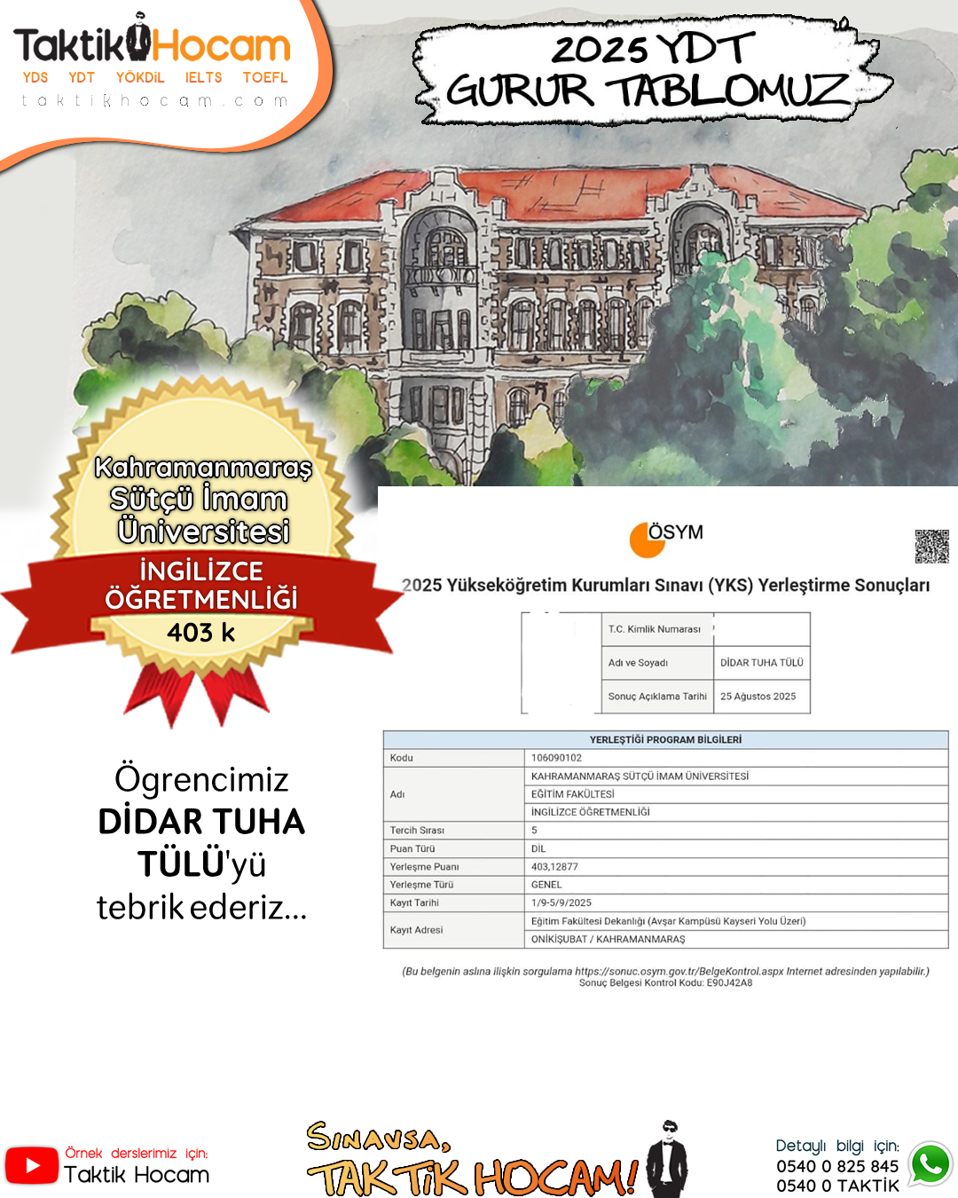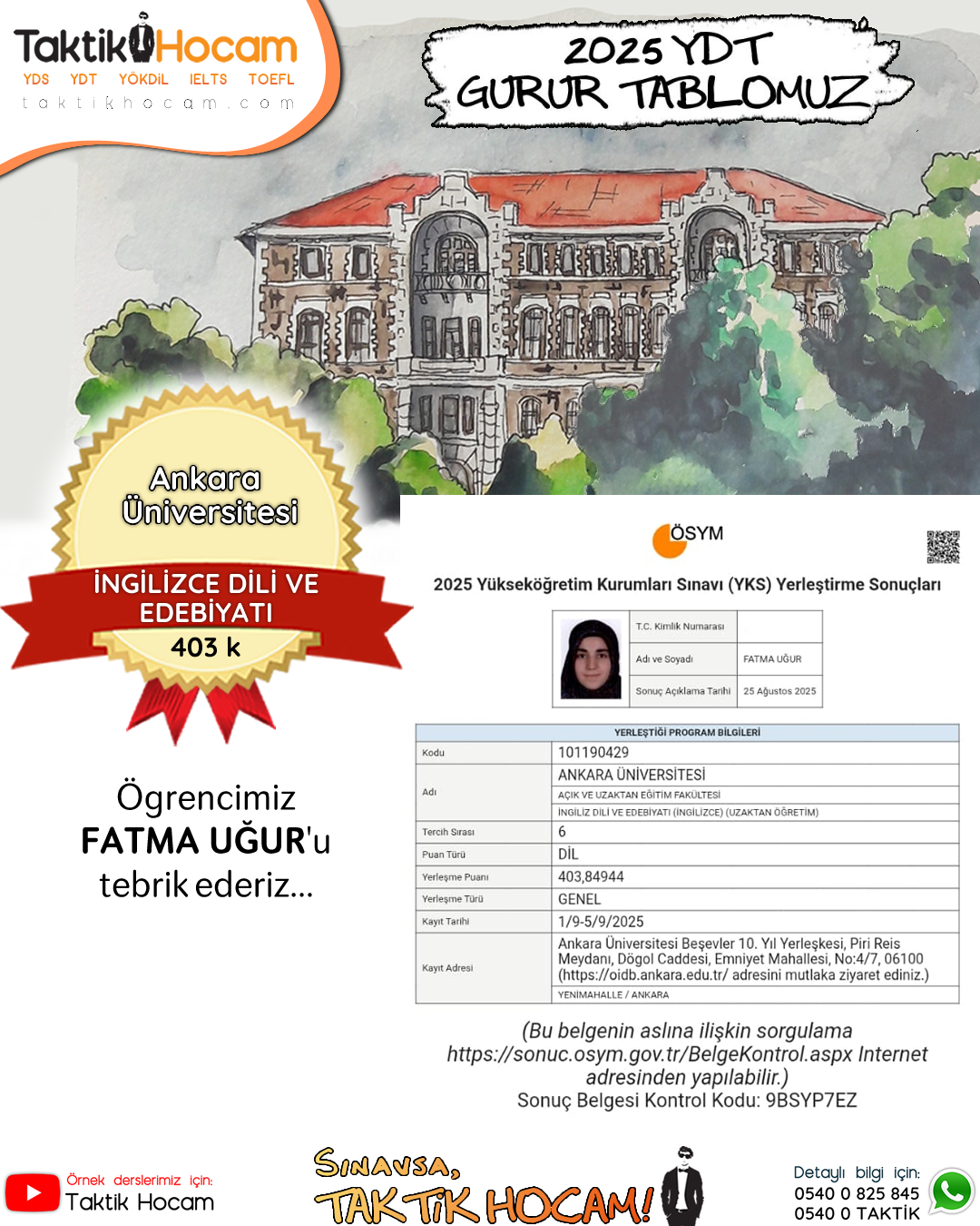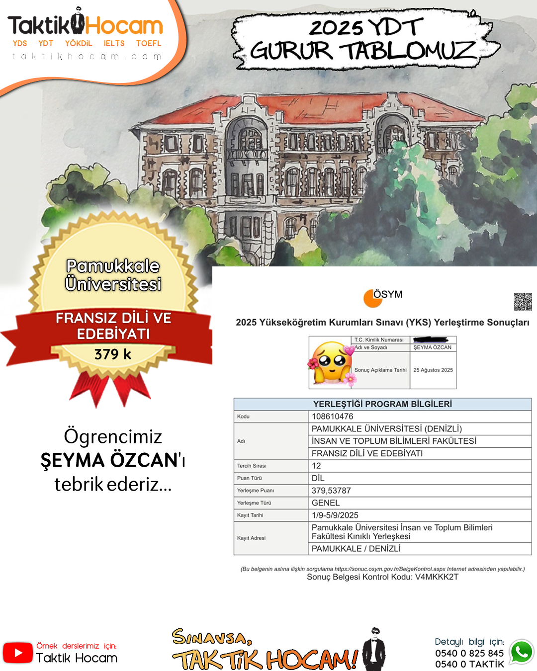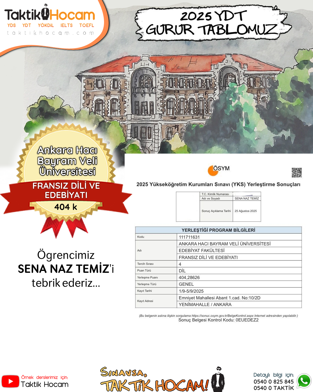 “Taktik hocam sayesinde yökdil den 87,5 aldım. Emeklerinize sağlık.”