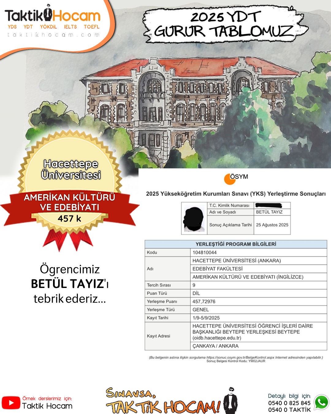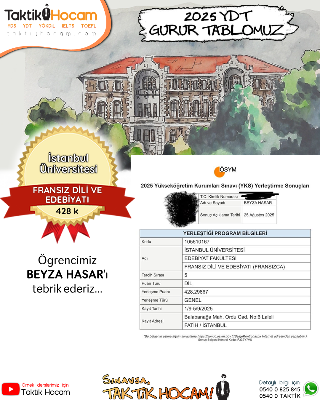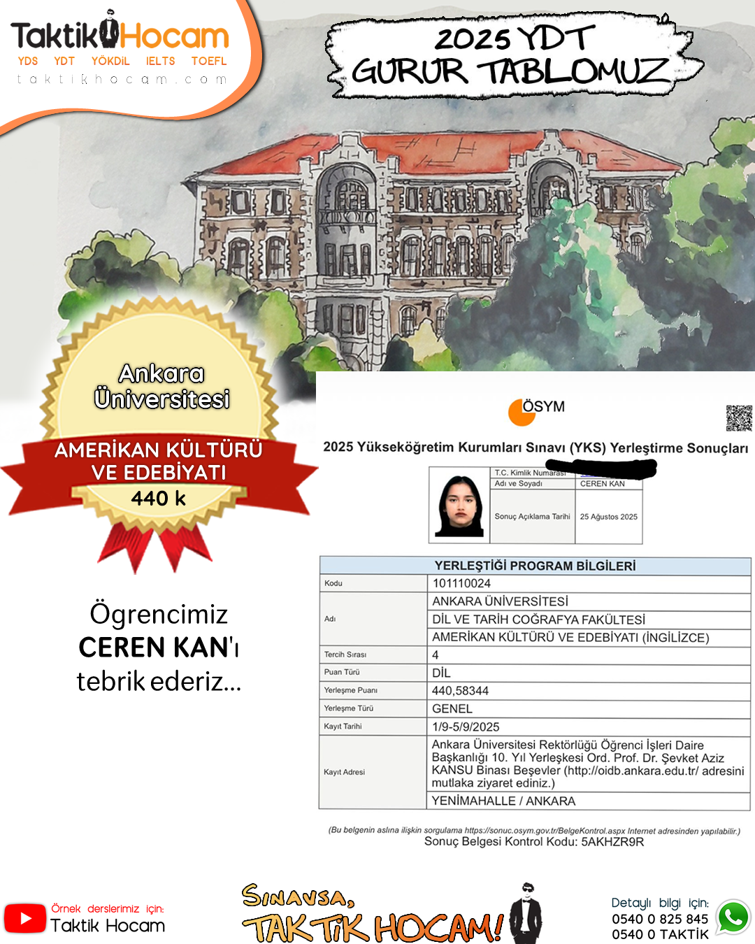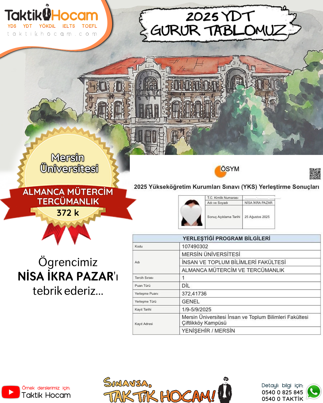 “Taktik hocam sayesinde yökdil den 87,5 aldım. Emeklerinize sağlık.”