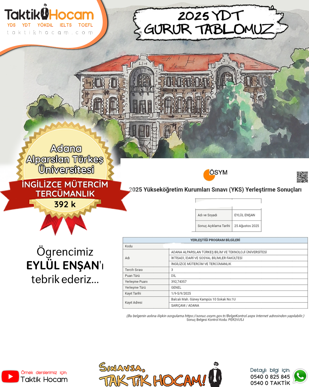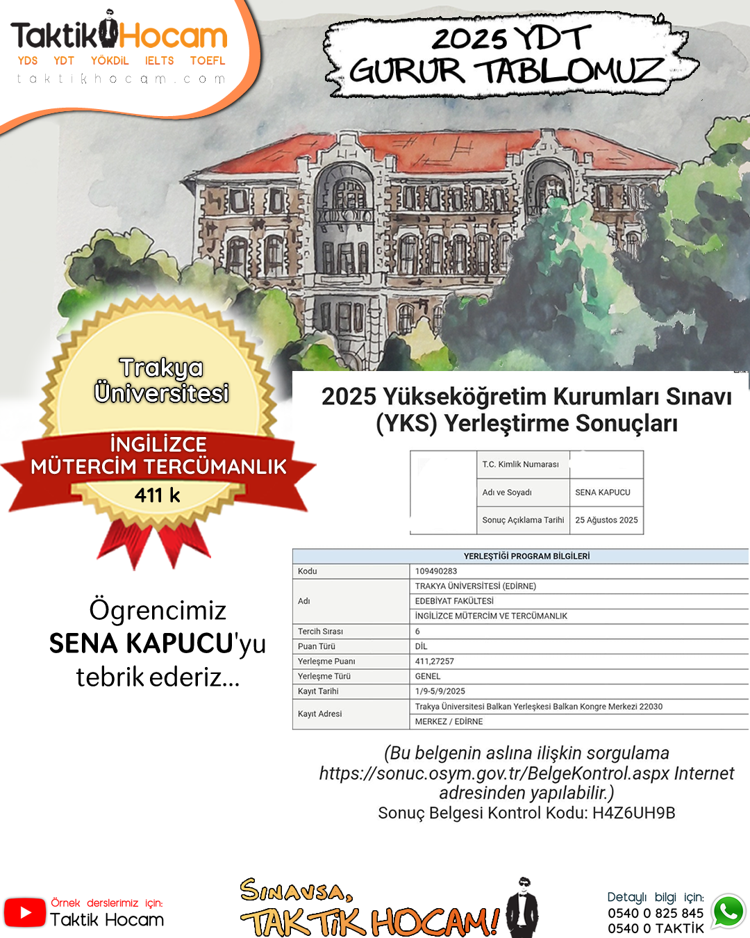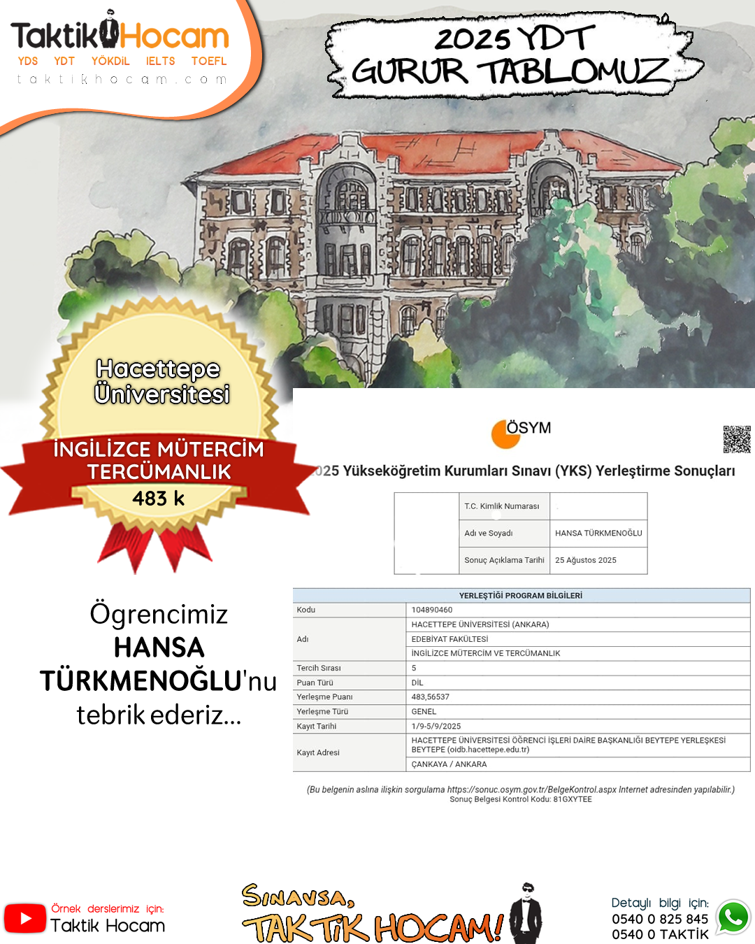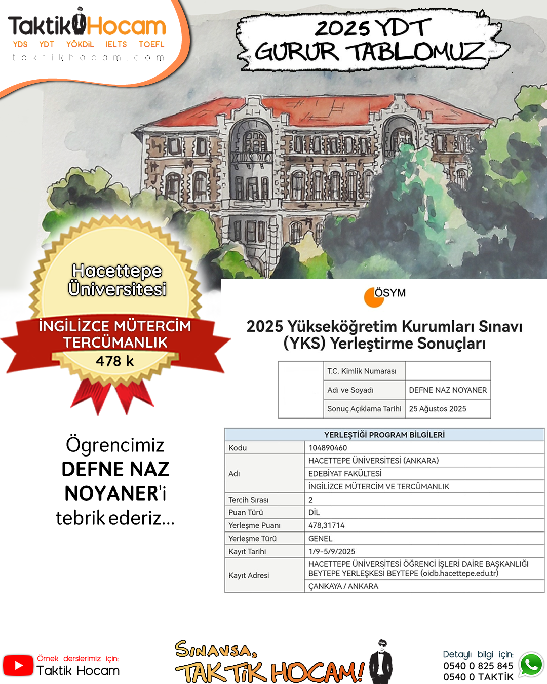 “Taktik hocam sayesinde yökdil den 87,5 aldım. Emeklerinize sağlık.”
